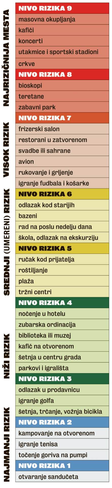 Stručnjaci su rangirali uobičajene aktivnosti na skali od jedan do devet, raspoređene tako da prvi nivo predstavlja najniži rizik, dok nivo devet označava najrizičnija mjesta i aktivnosti.