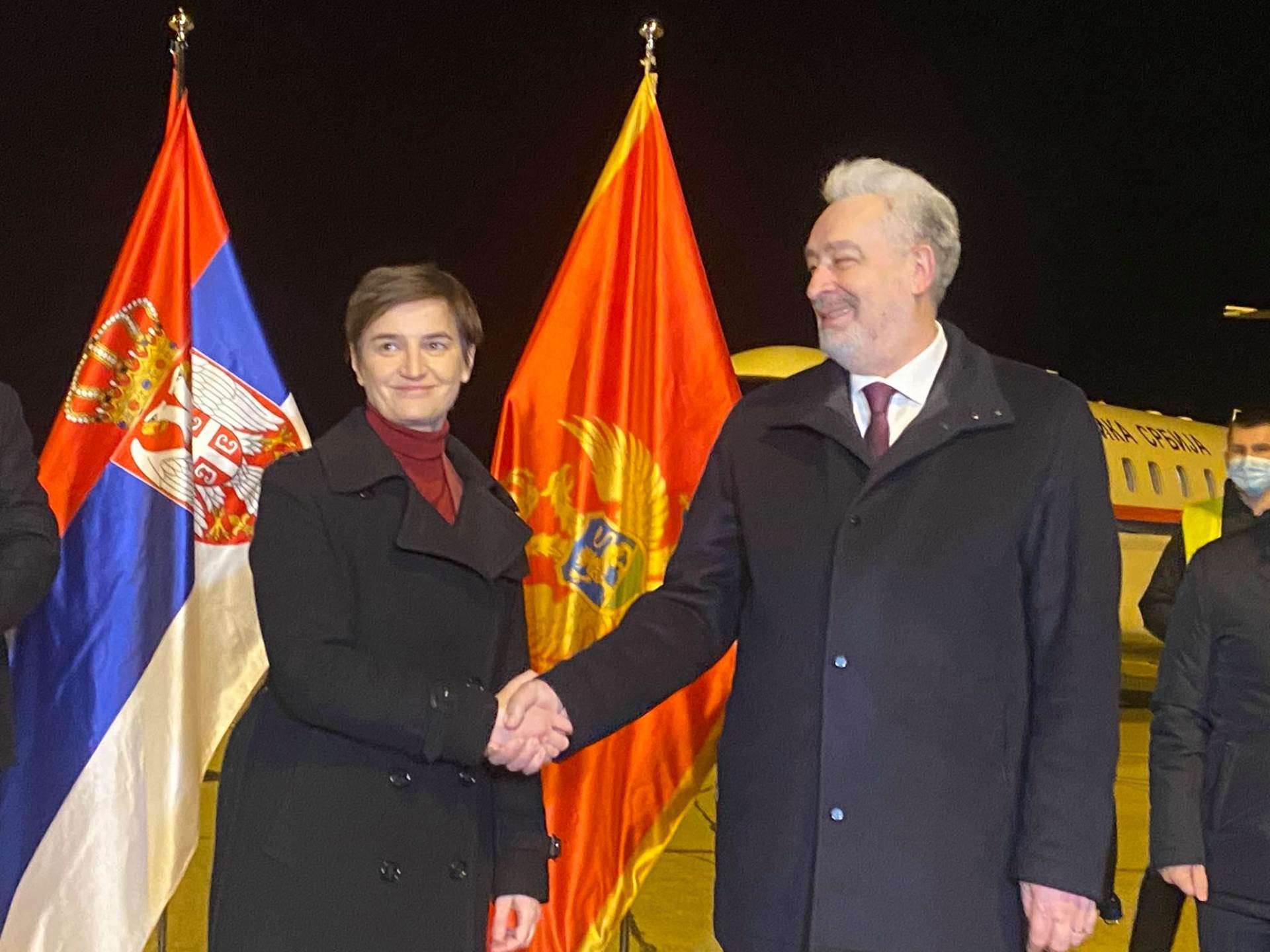 U Podgoricu je avionom države Srbije doputovala i premijerka Ana Brnabić koju su aerodromu dočekali premijer Zdravko Krivokapić, članovi njegovog kabineta, i ministarka zdravlja Jelena Borovinić Bojović.