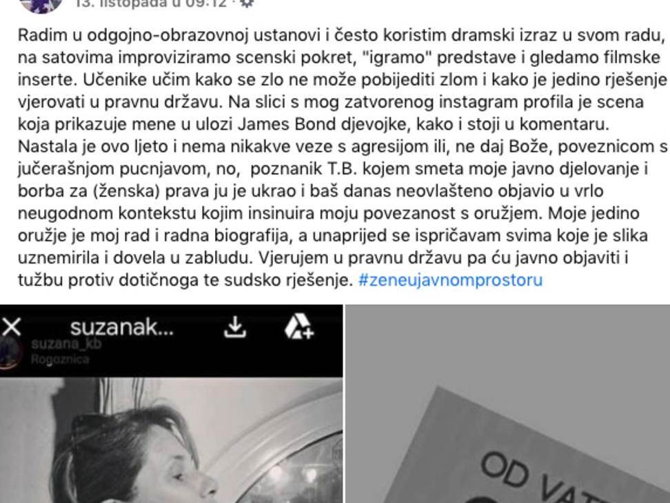 Proteklih dana društvenim mrežama počele su da kruže fotografije Suzane Kačić Bartulović, profesorke hrvatskog jezika na Ekonomskom i kancelarijskom fakultetu u Splitu, koja ponosno pozira s pištoljem u rukama.