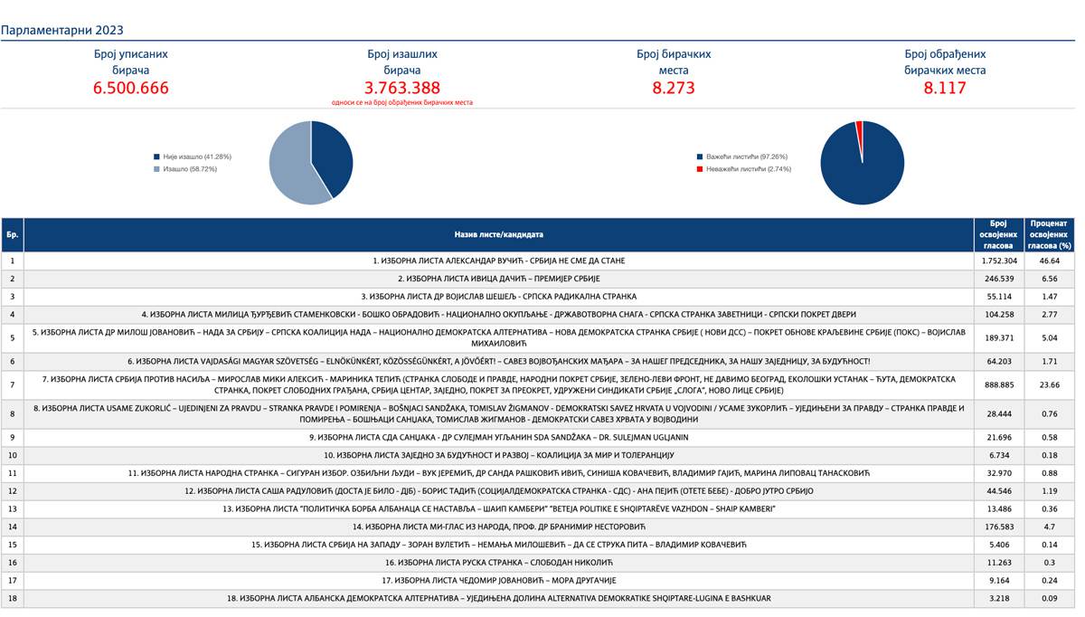 Prema rezultatima, koji su objavljeni u 7 časova i 26 minuta, izborna lista Aleksandar Vučić - Srbija ne sme da stane ima 46,64 odsto glasova. Druga po redu je lista Srbija protiv nasilja koja ima 23,66 procenata. Zatim slijedi izborna lista Ivica Dačić - premijer Srbije sa 6,56 odsto.