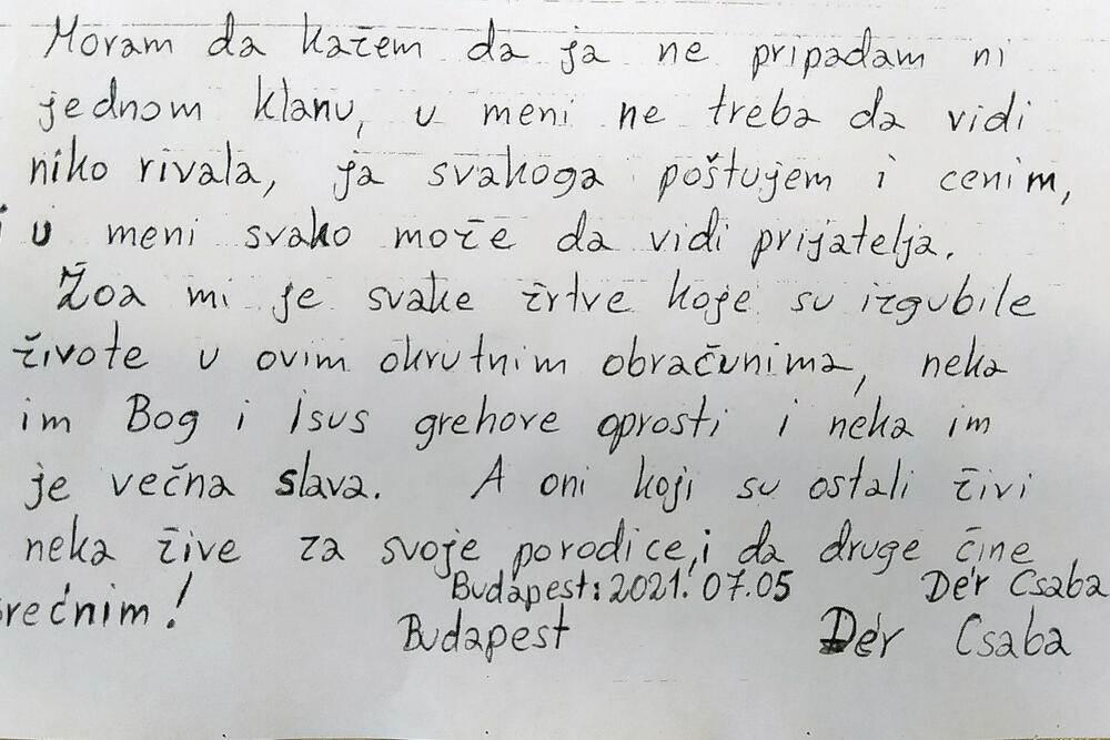 Ovim riječima, kako Kurir ekskluzivno saznaje, Čaba Der je u pismu koje je preko advokata poslao Višem sudu u Beogradu, opisao ubistvo Nebojše Markovića 5. januara 2019. na Banovom brdu, u Beogradu. Sud je odbio da pročita pismo, jer se Deru, koji je u Mađarskoj osuđen na doživotnu robiju, sudi u odsustvu.