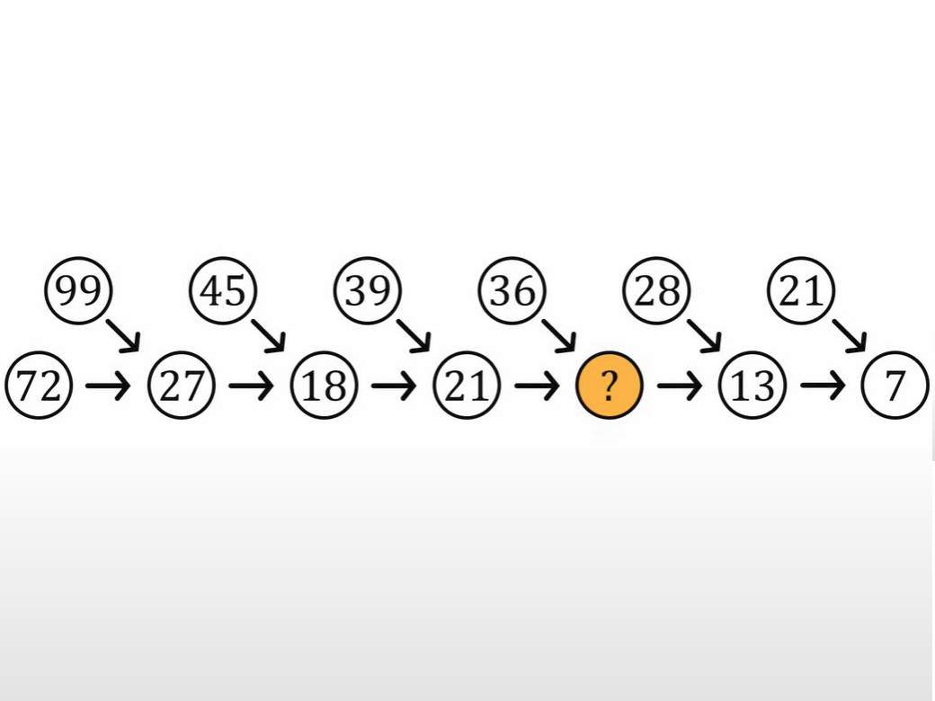 Pravo rešenje dobićete tako što ćete da saberete cifre dva broja da dobijete treći u kružiću – 9+++7+2=27, dalje 4+5+2+7=18 i tako redom, pa ćete doći do broja koji nedostaje – 12, odnosno (3+6+2+1=12).