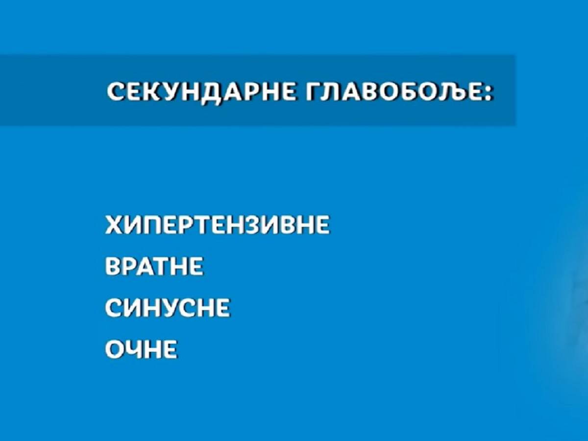 U sekundarne glavobolje spadaju hipertenzivna, vratna, sinusna i očna glavobolja.