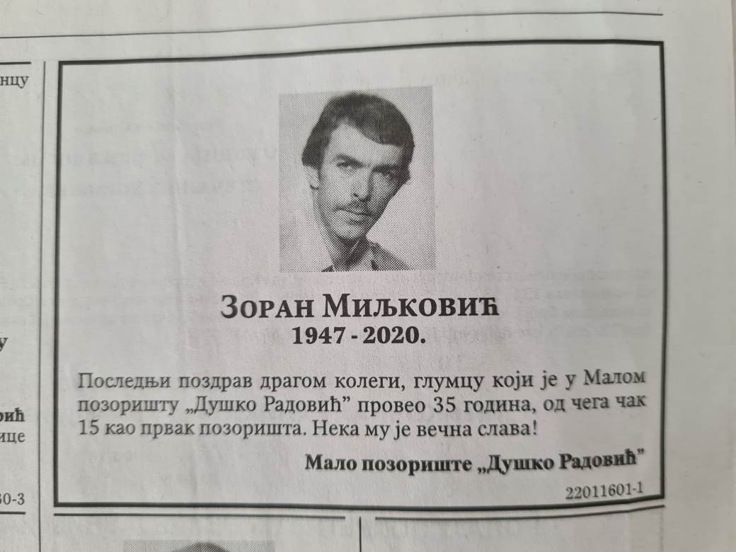 "Poslednji pozdrav dragom kolegi, glumcu koji je u Malom pozorištu Duško Radović proveo 35 godina, od čega 15 kao prvak pozorišta. Neka mu je večna slava", navodi se u čitulji.