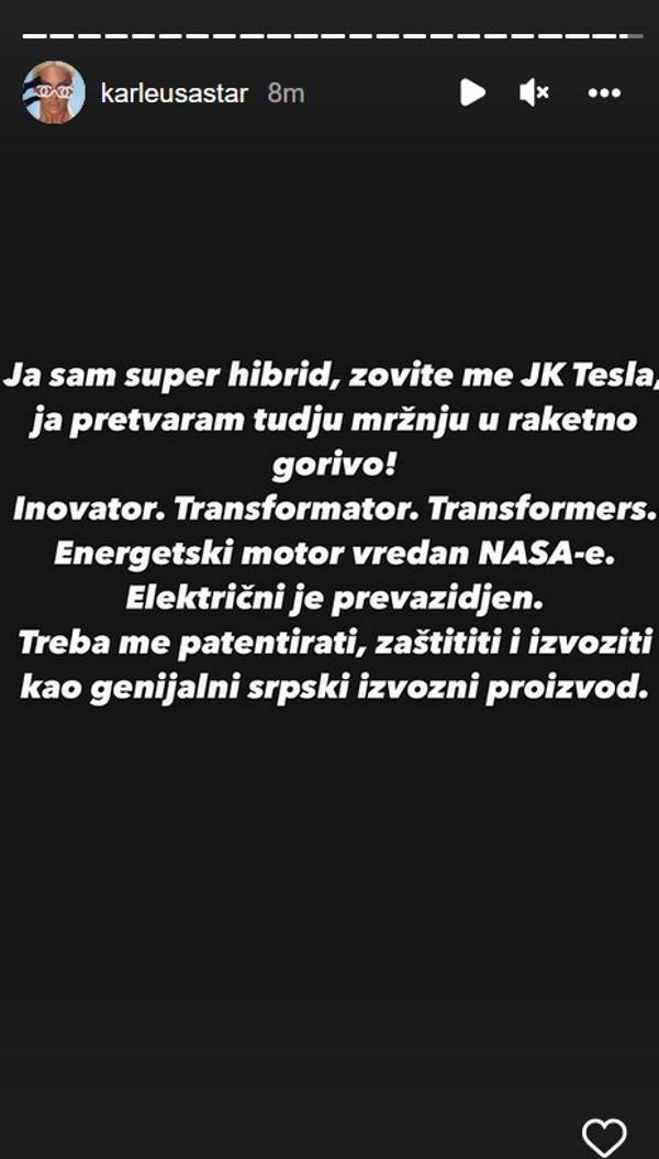 "Ja sam super hibrid, zovite me JK Tesla, ja pretvaram tuđu mržnju u raketno gorivo! Inovator. Transformator. Transformer. Energetski motor vredan NASA-e. Treba me patentirati, zaštititi i izvoziti kao genijalni srpski izvozni proizvod".