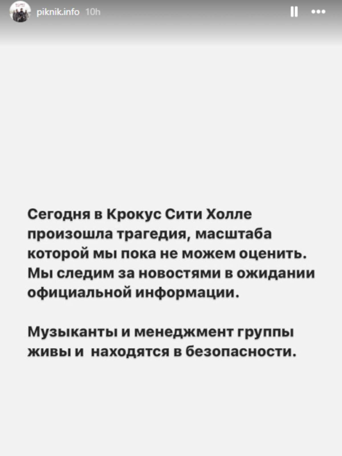Kako su pisali ruski mediji, potvrđeno je da među članovima benda "Piknik", koji je u tom trenutku trebao da održi koncert nema povrijeđenih, a izvođači su odmah evakuisani iz hale. Putem Instagram profila "Piknik.info", ali i Telegrama, muzičari su se oglasili o ovom tragičnom događaju i saopštili da su svi dobro.