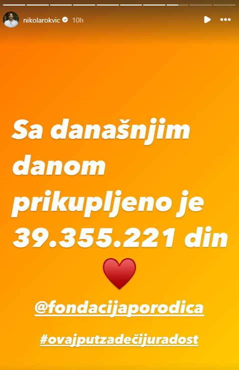 "Sa današnjim danom prikupljeno je 39.355.221 dinara", otkrio je na svom Instagram storiju.