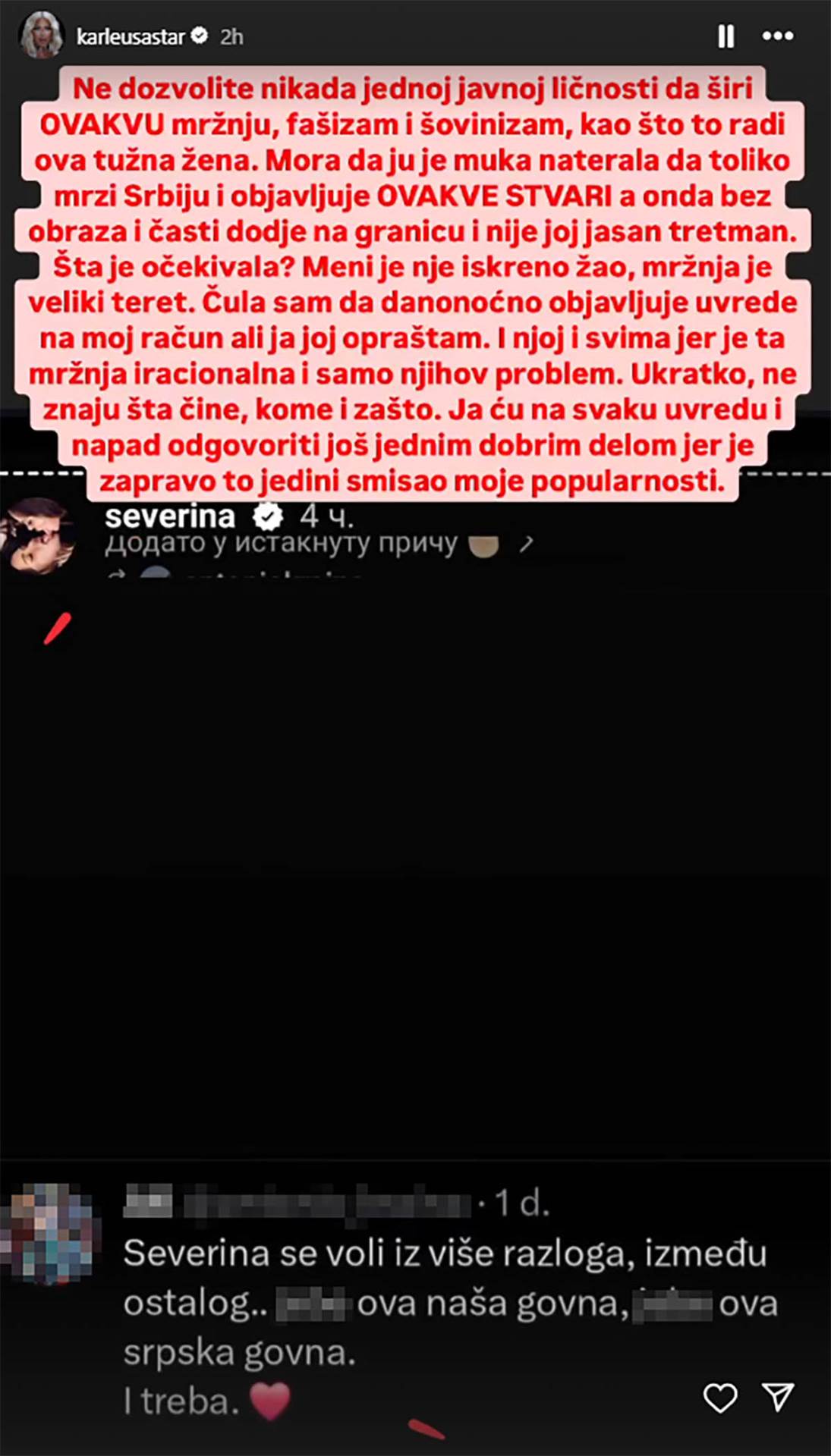 Ovo je jedna od gorućih tema i mnoge javne ličnosti su se oglasile kako bi dale svoj komentar, a Severina na svojim storijima na Instagramu objavljuje većinu poruka njenih fanova, prijatelja i ljudi koji je podržavaju. Sada je uradila isto, a čak je jedan status i istakla.