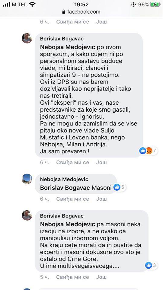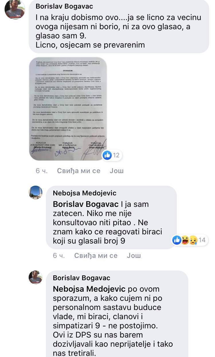 “Po ovom sporazumu, a kako čujem ni po personalnom sastavu buduće vlade, mi birači, članovi i simpatizeri 9 – ne postojimo. Ovi iz DPS-a su nas barem doživljavali kao neprijatelje i tako nas tretirali. Ovi “eksperti” nas i vas, naše predstavnike za koje smo glasali jednostavno ignorišu”, jedan je u moru komentara nezadovoljnih birača.