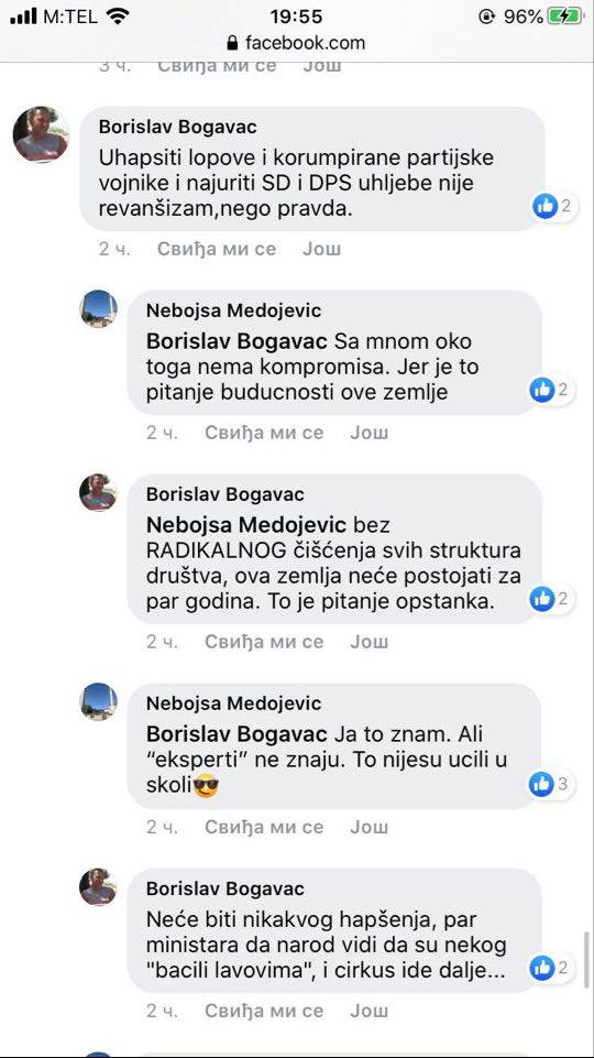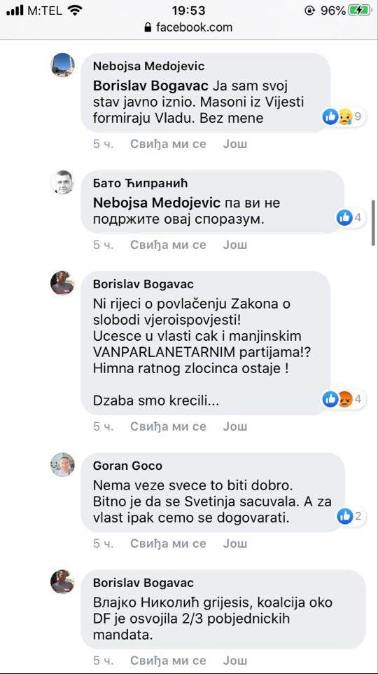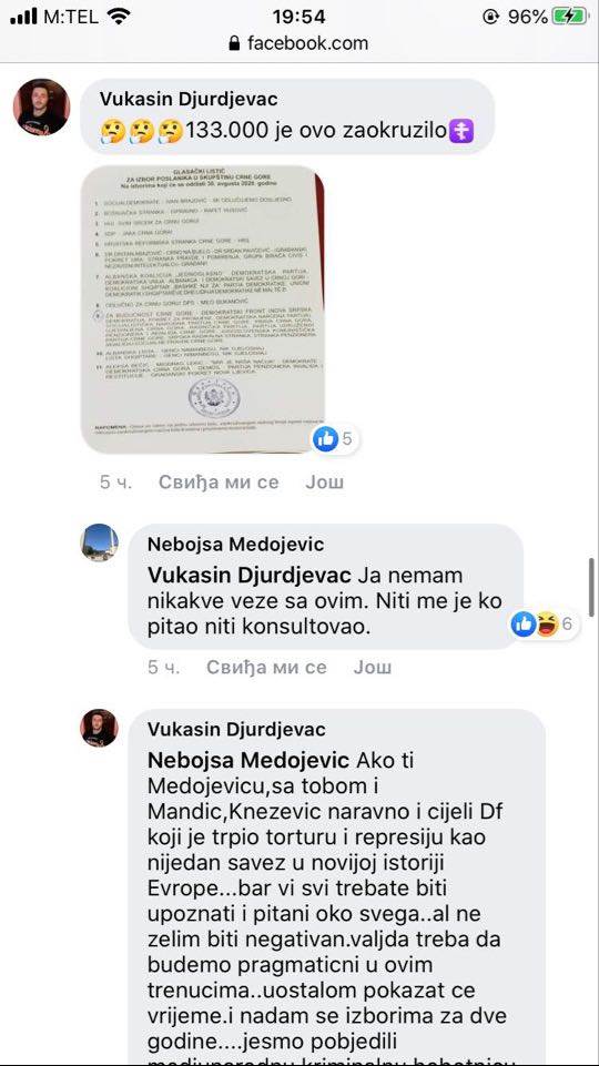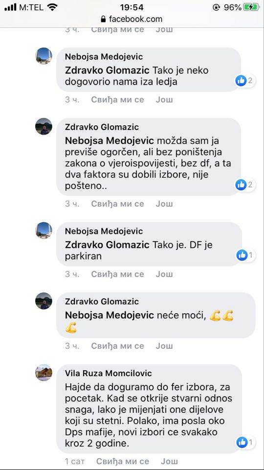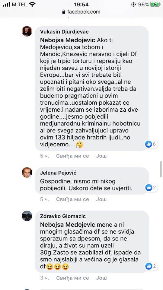 U centru prepiske putem Fejsbuka, našao se jedan od lidera DF-a, Nebojša Medojević koji svojim biračima kaže da on nikakve veze nema sa sporazumom, “niti ga je ko pitao niti konsultovao” oko toga.